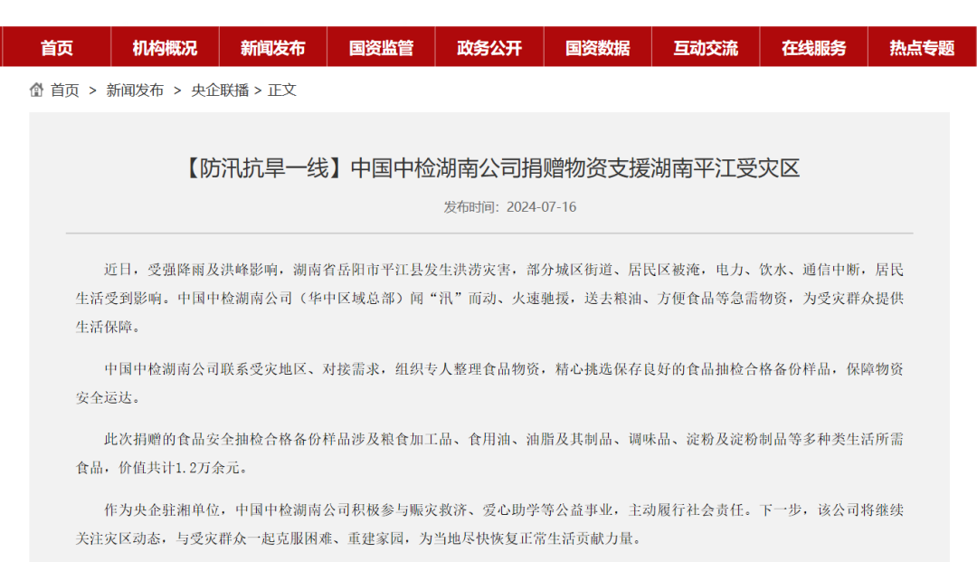 【中国中检湖南公司捐赠物资支援湖南平江受灾区】