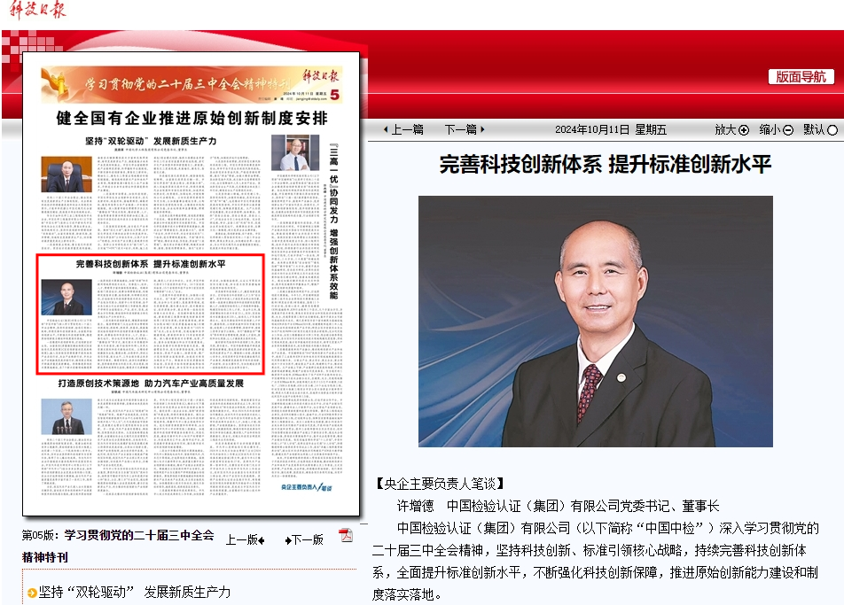 中国检验认证(集团)有限公司(以下简称“中国中检”)深入学习贯彻党的二十届三中全会精神,坚持科技创新、标准引领核心战略,持续完善科技创新体系,全面提升标准创新水平,不断强化科技创新保障,推进原始创新能力建设和制度落实落地。