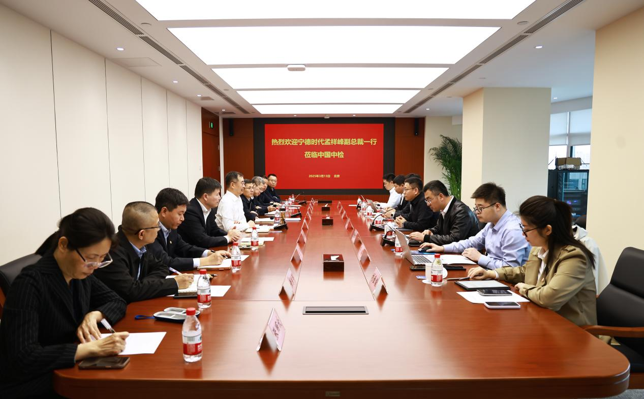 近日,中国中检党委副书记、总经理李永吉会见宁德时代副总裁孟祥峰一行,双方就前期合作成效、战略合作方向和具体合作领域等开展座谈交流。中国中检副总经理孙汉福出席会议。