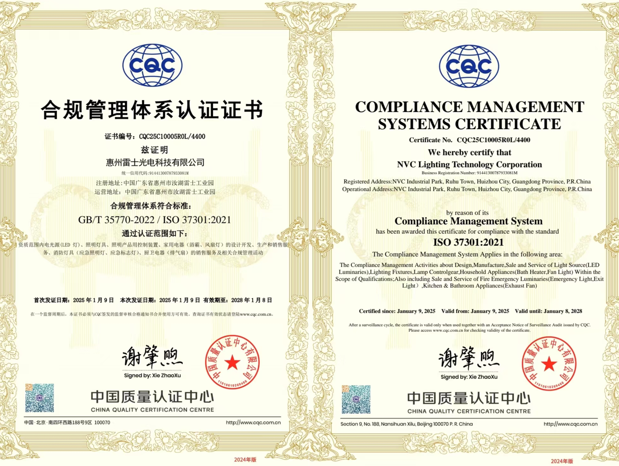 近日,中国中检广东公司助力惠州雷士光电科技有限公司(以下简称“雷士照明”)成功获得中国中检所属中国质量认证中心CQC颁发的合规管理体系认证证书。
