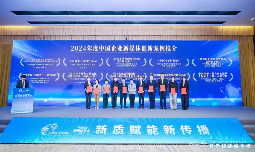 年会推介了国务院国资委新闻中心、中国公共关系协会联合征集的2024年度中国企业新媒体优秀案例。中国建筑、华润集团、中国东航、中国电子、中国铁建、中国能建、中广核、中国远洋海运、国投、中国中检的10部作品被推介为“创新优秀案例”,中国移动、中国中车、中核集团、中国石油、东方电气集团、哈电集团、中国华电、中国石化、兵器工业集团、中国电气装备的10部作品被推介为“创意优秀案例”,中国中铁、中国华能、中国中化、中交集团、航空工业集团、中储粮、南方电网、中国节能、通用技术集团、中国联通的10部作品被推介为“创作优秀案例”。
